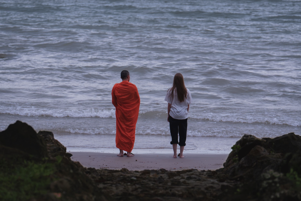 - โลกภายในวัด (The Temple) ใช้โทนสีอุ่น (Warm Tone) สีทอง สีส้มของจีวร แสงเทียน แต่ในความอบอุ่นนั้น กลับมีการจัดแสงแบบ High Contrast (แสงเงาจัดจ้าน) ที่ซ่อนใบหน้าตัวละครไว้ในเงามืดครึ่งหนึ่ง สื่อความหมายโดยนัยว่า “ภายใต้แสงธรรม มีเงามืดซ่อนอยู่เสมอ”